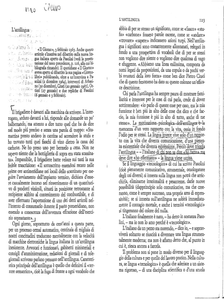 Segue il diretto riferimento all’italiano che Pasolini aveva definito “tecnologico” (cioè proposto