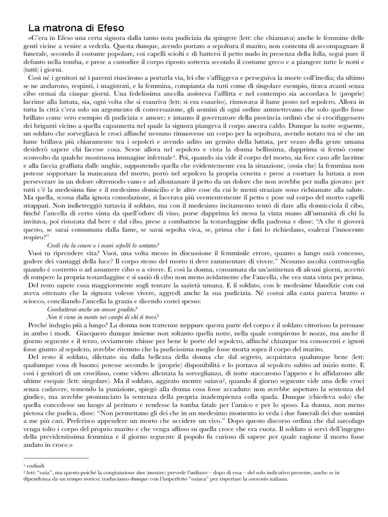 «C’era in Efeso una certa signora dalla tanto nota pudicizia da spingere (lett: che chiamava) anche le femmine delle
