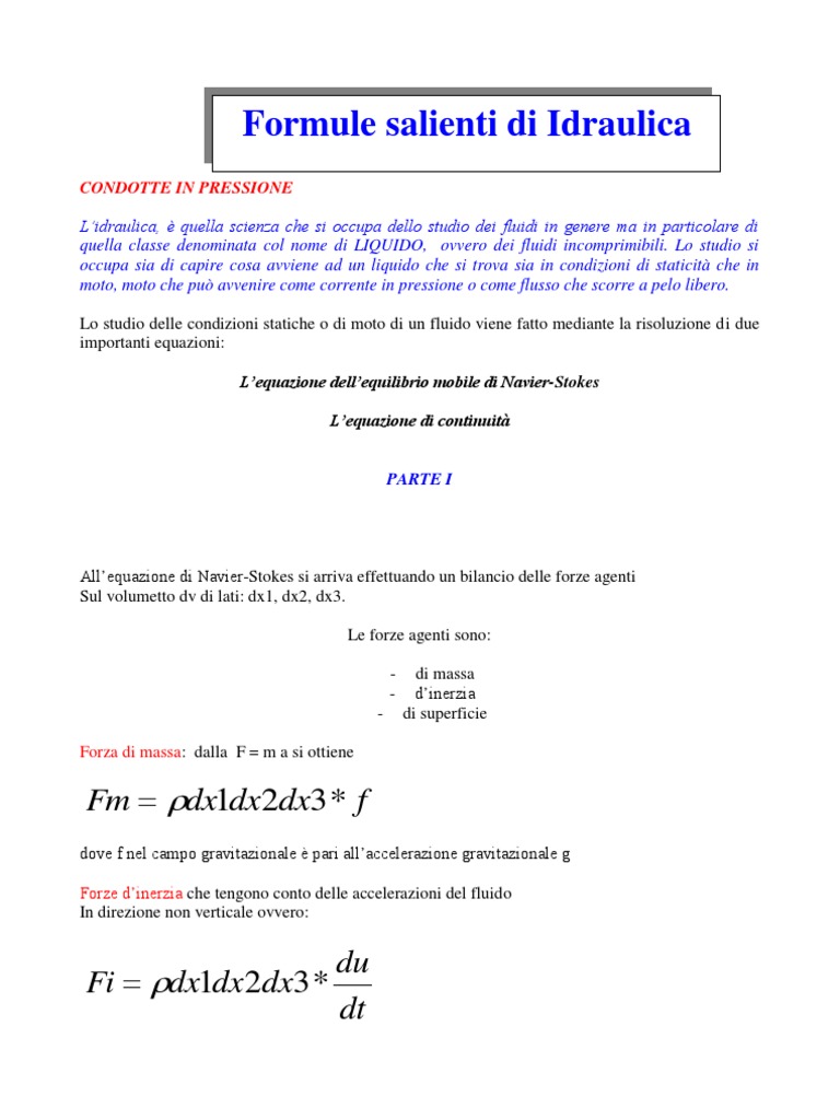 Lo studio delle condizioni statiche o di moto di un fluido viene fatto mediante la risoluzione di due