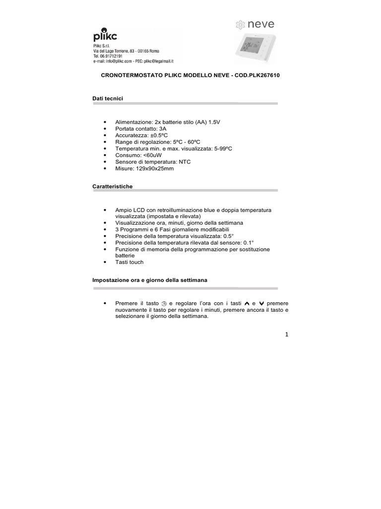 CRONOTERMOSTATO PLIKC MODELLO NEVE - COD.