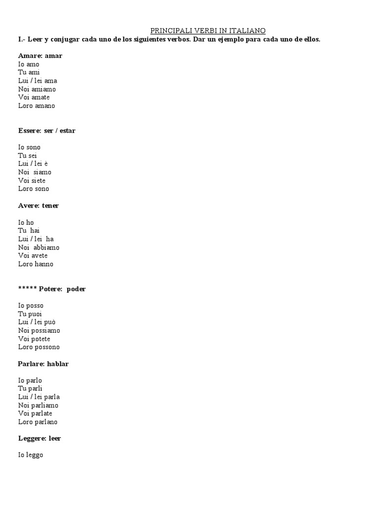 PRINCIPALI VERBI IN ITALIANO