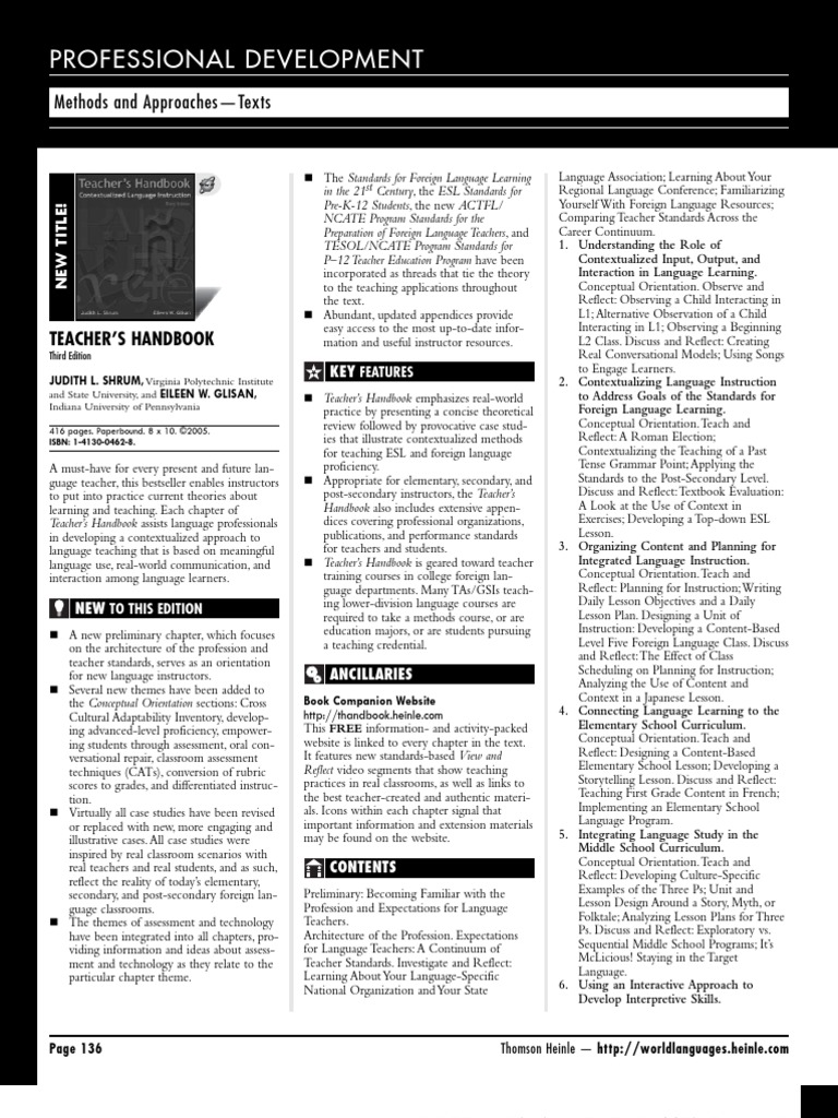 Teacher’s Handbook assists language professionals dices covering professional organizations, Exercises; Developing a Top-down ESL