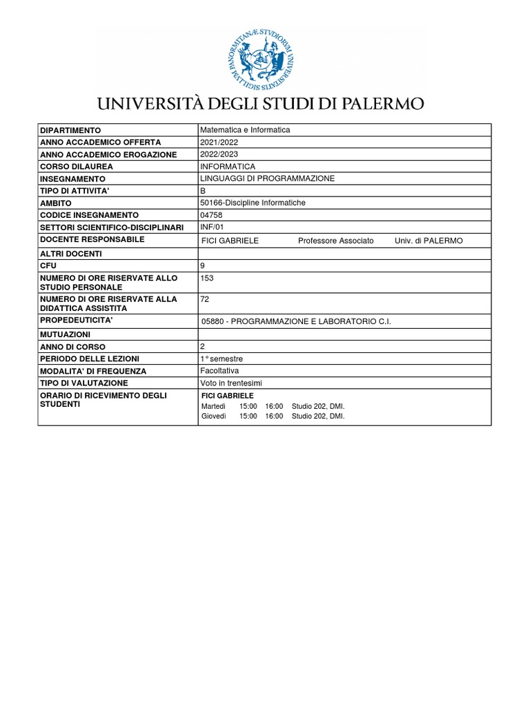 DOCENTE RESPONSABILE FICI GABRIELE Professore Associato Univ. di PALERMO