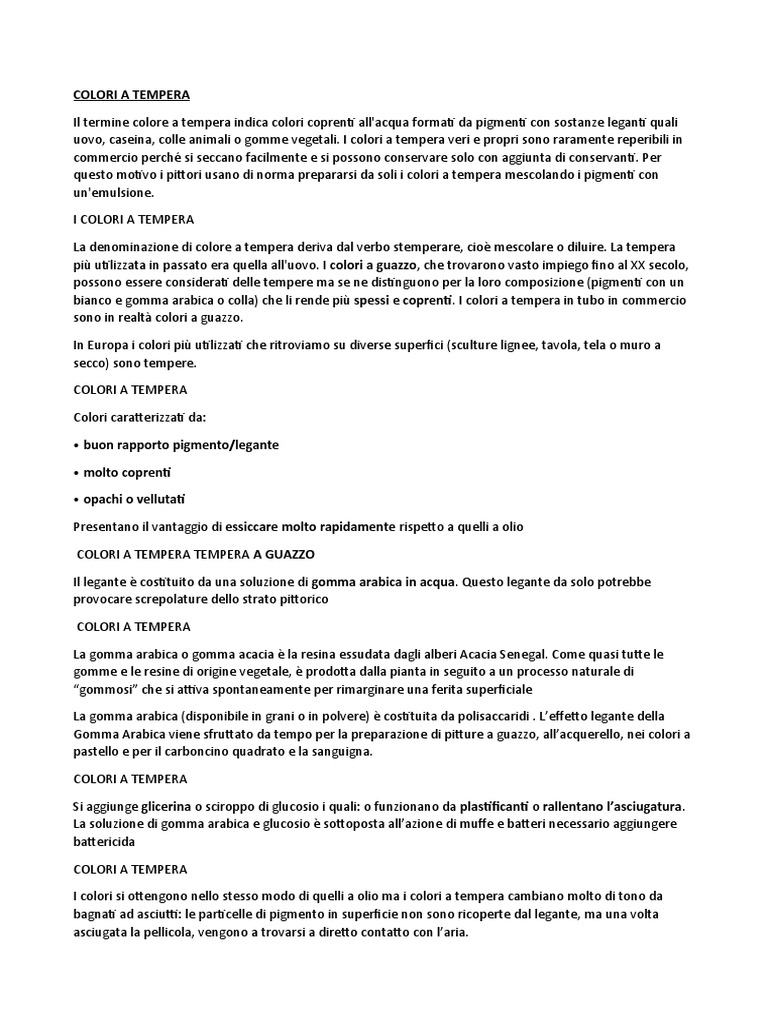bianco e gomma arabica o colla) che li rende più spessi e coprenti. I colori a tempera in tubo in commercio