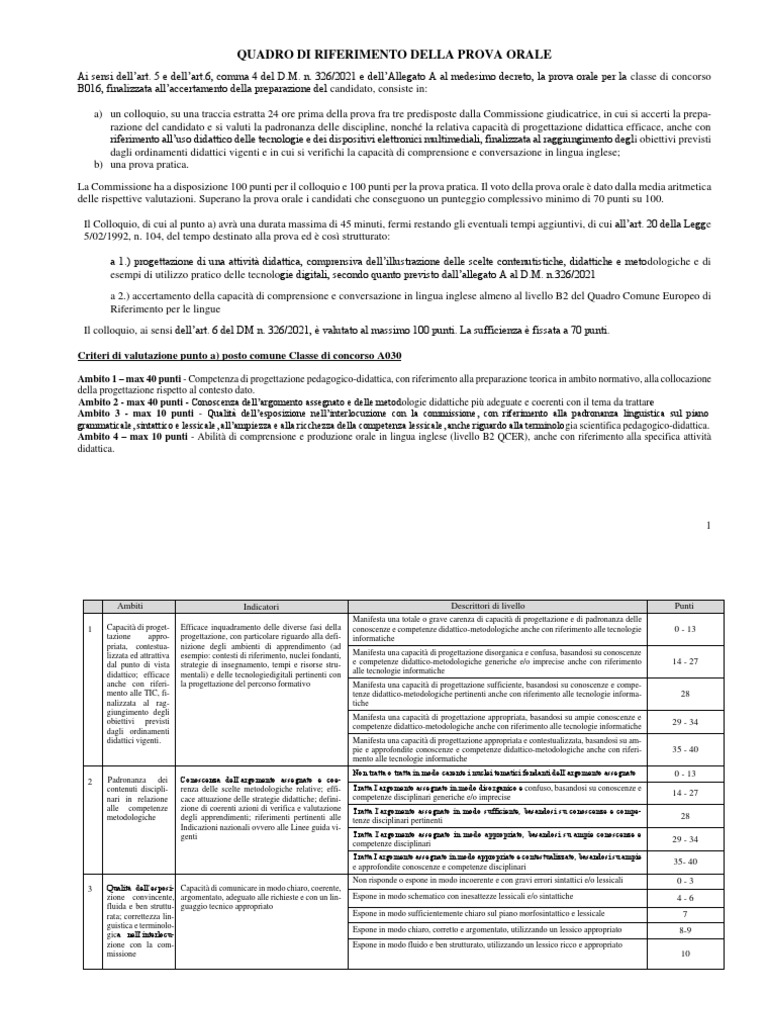 Ai sensi dell’art. 5 e dell’art.6, comma 4 del D.M. n. 326/2021 e dell’Allegato A al medesimo decreto, la prova orale per la classe di concorso