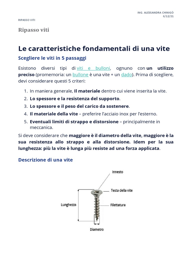 Una vite è definita da diverse caratteristiche tecniche che ne