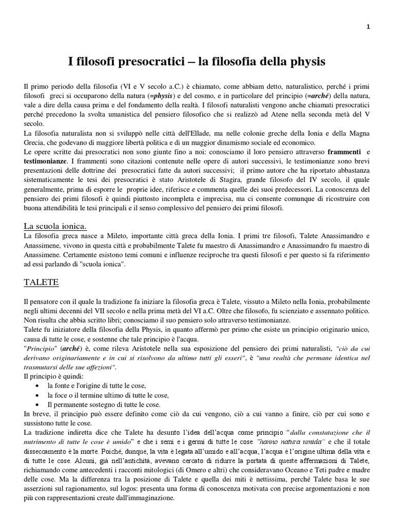 Il pensatore con il quale la tradizione fa iniziare la filosofia greca è Talete, vissuto a Mileto nella Ionia, probabilmente