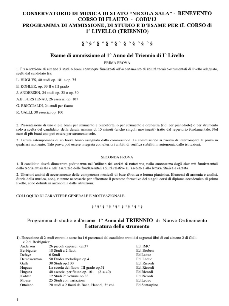 Esame di ammissione al 1° Anno del Triennio di I° Livello
