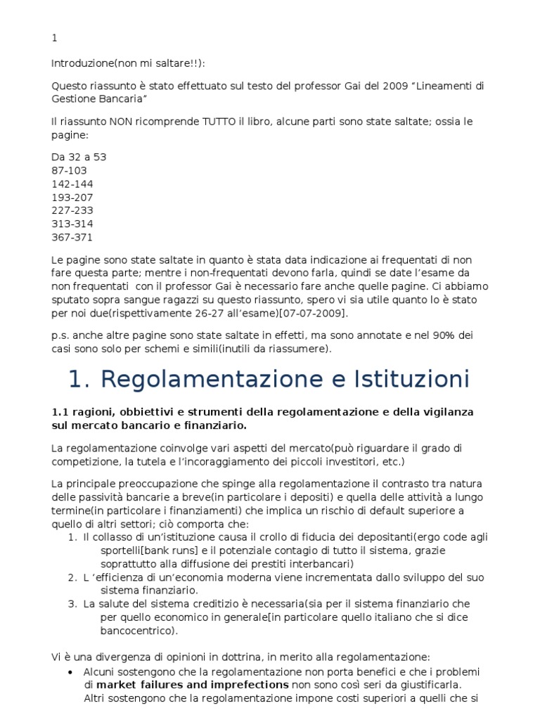 ): Questo riassunto stato effettuato sul testo del professor Gai del 2009 Lineamenti di Gestione Bancaria Il riassunto NON ricomprende TUTTO il libro, alcune parti sono state saltate; ossia le pagine: Da 32 a 53 87-103 142-144 193-207 227-233 313-314 367-371 Le pagine sono state saltate in quanto stata data indicazione ai frequentati di non fare questa parte; mentre i non-frequentati devono farla, quindi se date lesame da non frequentati con il professor Gai necessario fare anche quelle pagine. Ci abbiamo sputato sopra sangue ragazzi su questo riassunto, spero vi sia utile quanto lo stato per noi due(rispettivamente 26-27 allesame)[07-07-2009]. p.s. anche altre pagine sono state saltate in effetti, ma sono annotate e nel 90% dei casi sono solo per schemi e simili(inutili da riassumere).