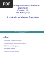 1.1 ragioni, obbiettivi e strumenti della regolamentazione e della vigilanza sul mercato bancario e finanziario. La regolamentazione coinvolge vari aspetti del mercato(pu riguardare il grado di competizione, la tutela e lincoraggiamento dei piccoli investitori, etc.) La principale preoccupazione che spinge alla regolamentazione il contrasto tra natura delle passivit bancarie a breve(in particolare i depositi) e quella delle attivit a lungo termine(in particolare i finanziamenti) che implica un rischio di default superiore a quello di altri settori; ci comporta che: 1. Il collasso di unistituzione causa il crollo di fiducia dei depositanti(ergo code agli sportelli[bank runs] e il potenziale contagio di tutto il sistema, grazie soprattutto alla diffusione dei prestiti interbancari) 2. L efficienza di uneconomia moderna viene incrementata dallo sviluppo del suo sistema finanziario. 3. La salute del sistema creditizio necessaria(sia per il sistema finanziario che per quello economico in generale[in particolare quello italiano che si dice bancocentrico). Vi una divergenza di opinioni in dottrina, in merito alla regolamentazione: Alcuni sostengono che la regolamentazione non porta benefici e che i problemi di market failures and imprefections non sono cos seri da giustificarla. Altri sostengono che la regolamentazione impone costi superiori a quelli che si