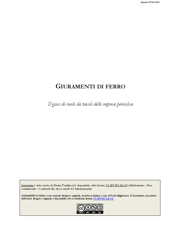 GIURAMENTI DI FERRO è una variante del gioco originale, tradotta in italiano a cura di Paolo Migliavacca. Il documento, non rivisto