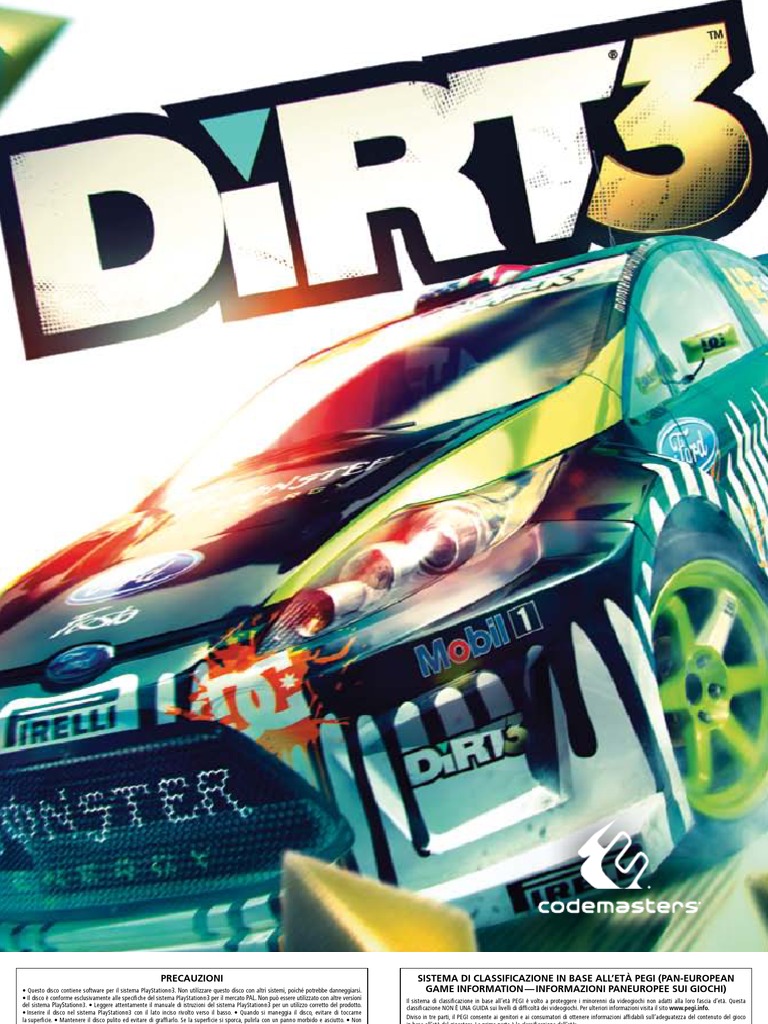 ESCLUSIVAMENTE AD USO DOMESTICO Il presente software concesso in licenza per lutilizzo esclusivo con i sistemi PlayStation3 autorizzati. Qualsiasi accesso, utilizzo o trasferimento del prodotto o il copyright implicito e marchi registrati non autorizzati sono proibiti. Si consiglia di visitare [Link]/terms per i diritti di utilizzo completi. Library programs 1997-2011 Sony Computer Entertainment Inc. concesso in licenza esclusivamente a Sony Computer Entertainment Europe (SCEE). LA RIVENDITA E IL NOLEGGIO SONO VIETATI SALVO ESPRESSAMENTE AUTORIZZATO DA SCEE. PlayStationNetwork, PlayStationStore e PlayStationHome sono soggetti a specifici termini di utilizzo e non sono disponibili in tutti i Paesi e in tutte le lingue ([Link]/terms). necessaria una connessione Internet a banda larga. I costi di accesso alla connessione a banda larga sono a carico dellutente. Alcuni contenuti sono a pagamento. Gli utenti devono avere almeno 7 anni e per i minorenni richiesto il consenso dei genitori. Concesso in licenza per la vendita esclusiva in Europa, Medio Oriente, Africa, India ed Oceania. 2, PlayStation, PS3, KHJL, SIXAXIS and are trademarks or registered trademarks of Sony Computer Entertainment Inc. is a trademark of the same company. Blu-ray Disc and BD are trademarks. DiRT3 2010 The Codemasters Software Company Limited ("Codemasters"). All rights reserved. "Codemasters", EGO, the Codemasters logo and DiRT are registered trademarks owned by Codemasters. DiRT 3 is a trademark of Codemasters. DTS and the DTS Symbol are registered trademarks of DTS, Inc. and DTS Digital Surround is a trademark of DTS, [Link] Bink Video. Copyright 1997-2011 by RAD Game Tools, Inc. YouTube and the YouTube logo are trademarks of Google Inc. Portions of this software are copyright 2009 The FreeType Project ([Link]). All rights reserved. BMCode copyright 2001 - 2011 andreas jnsson. Automobiles included in this game may be different from the actual automobiles in movement and performance. Do not imitate the driving and movements shown in this game. And remember, when driving an automobile in real life, always drive it safely. All other copyrights or trademarks are the property of their respective owners and are being used under license. This game is NOT licensed by or associated with the FIA or any related company. Unauthorized copying, adaptation, rental, lending, re-sale, arcade use, charging for use, broadcast, cable transmission, public performance, distribution or extraction of this product or any trademark or copyright work that forms part of this product is prohibited. Developed and published by Codemasters. Made in Austria. All rights reserved.