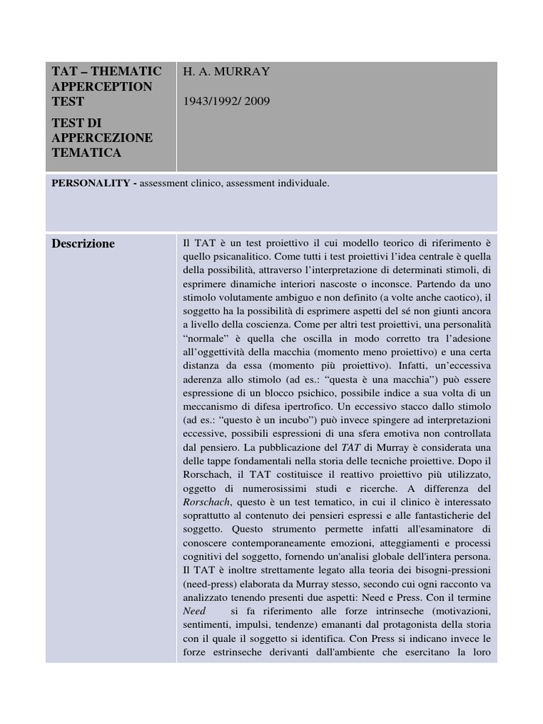 Descrizione Il TAT è un test proiettivo il cui modello teorico di riferimento è