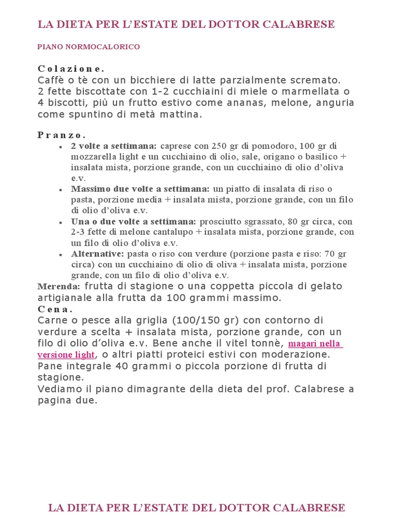 Vediamo il piano dimagrante della dieta del prof. Calabrese a