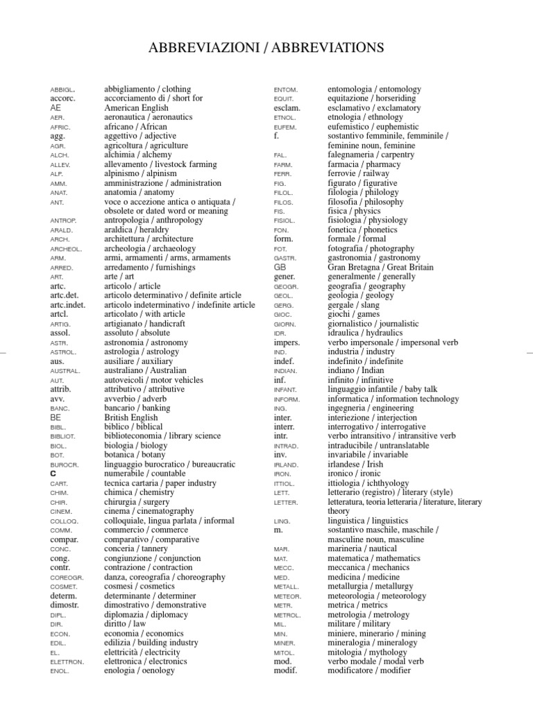 Le abbreviazioni riportate qui in MAIUSCOLETTO, esattamente come nel testo del dizionario, indicano registri espressivi, linguaggi settoriali e delimitazioni locali; le altre, che nel dizionario compaiono in vari tipi di carattere, sono relative a categorie e altre specificazioni grammaticali. The abbreviations given in SMALL CAPITAL letters here, as in the rest of the dictionary, indicate register, subject-field jargon and regional usage; the others, which appear in various fonts, are related to grammatical categories and other information.