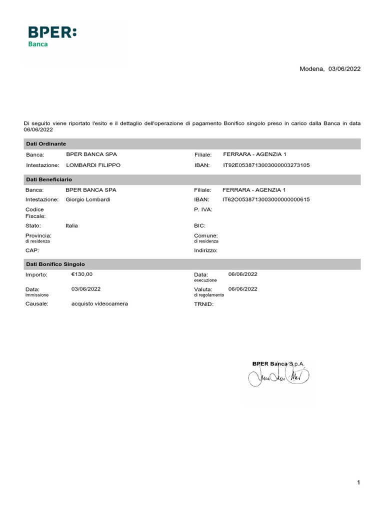 Importo: €130,00 Data: 06/06/2022