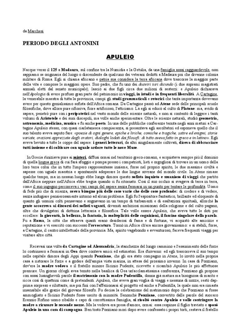 La vita del pi grande scrittore latino del II sec. d.C. frammentaria e le notizie ci vengono dalla sua opera. Apuleio famoso per la magia e per il processo in cui riusc a difendersi dallaccusa di magia. Egli nacque a Madaura, nord Africa, intorno al 120-125. Studi a Cartagine e ad Atene. Fece molti viaggi come conferenziere in cui mostrava la sua bravura come retore. E lepoca della seconda sofistica in cui i retori sono molto richiesti per tenere discorsi ufficiali in occasione di feste, commemorazioni, omaggi a personaggi illustri: di solito questi oratori fanno bella mostra delle loro capacit. Apuleio, grazie alla sua abilit oratoria, acquista grande fama. Nei suoi viaggi si ferma ad Oea, presso un amico, di cui sposa la madra Pudentilla, vedova di 14 anni pi anziana. Ma i parenti lo accusano di magia per aver sedotto Pudentilla. Apuleio per riesce a difendersi molto bene e viene assolto. Sembra, dallantologia Florida, che contiene molti suoi discorsi, che a Cartagine costruirono una statua in suo