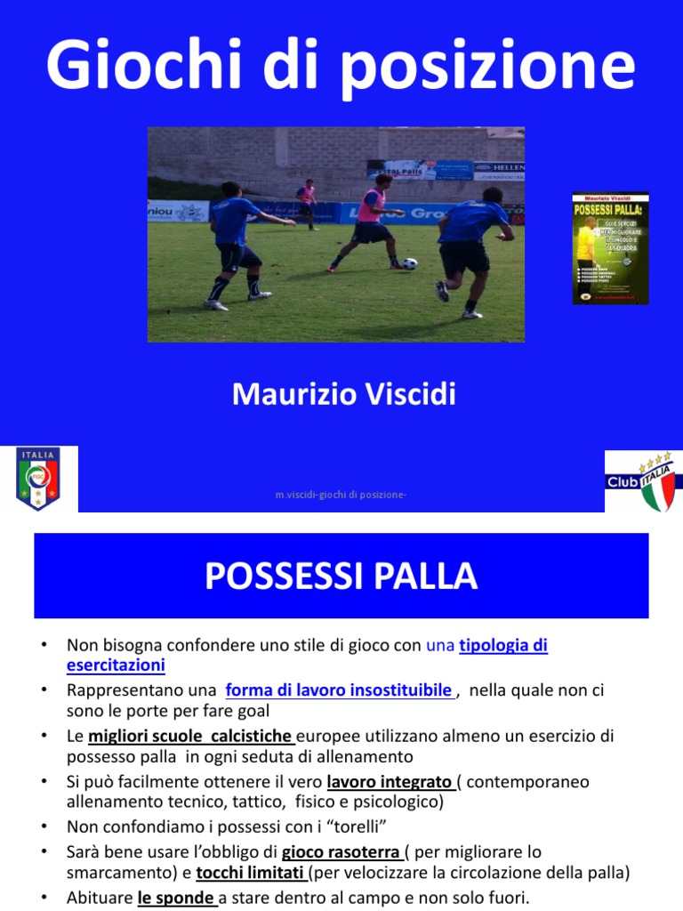 Non bisogna confondere uno stile di gioco con una tipologia di esercitazioni Rappresentano una forma di lavoro insostituibile , nella quale non ci sono le porte per fare goal Le migliori scuole calcistiche europee utilizzano almeno un esercizio di possesso palla in ogni seduta di allenamento Si pu facilmente ottenere il vero lavoro integrato ( contemporaneo allenamento tecnico, tattico, fisico e psicologico) Non confondiamo i possessi con i torelli Sar bene usare lobbligo di gioco rasoterra ( per migliorare lo smarcamento) e tocchi limitati (per velocizzare la circolazione della palla) Abituare le sponde a stare dentro al campo e non solo fuori. Dato statistico: nella serie A italiana maschile ci sono di media 350 passaggi per squadra a partita
