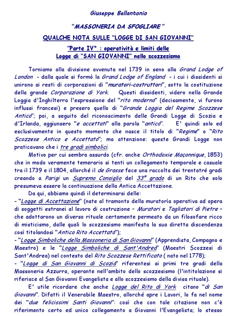MASSONERIA DA SFOGLIARE QUALCHE NOTA SULLE LOGGE DI SAN GIOVANNI Parte IV : operativit e limiti delle Logge di SAN GIOVANNI nello scozzesismo Torniamo alla divisione avvenuta nel 1739 in seno alla Grand Lodge of London - dalla quale si form la Grand Lodge of England - i cui i dissidenti si unirono ai resti di corporazioni di muratori-costruttori, sotto la costituzione della grande Corporazione di York. Questi dissidenti, videro nella Grande Loggia d'Inghilterra l'espressione del rito moderno (decisamente, vi furono influssi francesi) e presero quello di Grande Loggia del Regime Scozzese Antico; poi, a seguito del riconoscimento delle Grandi Logge di Scozia e d'Irlanda, aggiunsero e accettati alla parola antico. E' quindi solo ed esclusivamente in questo momento che nasce il titolo di Regime o Rito Scozzese Antico e Accettato; ma attenzione: queste Grandi Logge non praticavano che i tre gradi simbolici. Motivo per cui sembra assurdo (cfr. anche Orthodoxie Maonnique, 1853) che in modo veramente temerario si tenti un collegamento temporale e casuale tra il 1739 e il 1804, allorch il de Grasse fece una raccolta dei trentatr gradi creando a Parigi un Supremo Consiglio del 33 grado di un Rito che solo presumeva essere la continuazione della Antica Accettazione. Da qui, abbiamo quindi il determinarsi delle: - Logge di Accettazione (nate al tramonto della muratora operativa ad opera di soggetti estranei al lavoro di costruzione Muratori e Tagliatori di Pietre che adottarono un diverso rituale certamente permeato da un filosofare ricco di misticismo, dalle quali lo scozzesismo manifesta la sua diretta discendenza cos titolandosi Antico Rito Accettato); - Logge Simboliche della Massoneria di San Giovanni (Apprendista, Compagno e Maestro) e le Logge Simboliche di Sant'Andrea (Maestri Scozzesi di Sant'Andrea) nel contesto del Rito Scozzese Rettificato ( nato nel 1778); - Logge di San Giovanni di Scozia riferentesi ai primi tre gradi della Massoneria Azzurra, operante nell'ambito dello scozzesismo (l'intitolazione si riferisce al San Giovanni Evangelista e allo scozzesismo della divisa rituale). E' utile ricordare che anche Logge del Rito di York citano di San Giovanni. Difatti il Venerabile Maestro, allorch apre i Lavori, lo fa nel nome dei due felicissimi Santi Giovanni: cos che con tale citazione non c' riferimento certo ed unico collegamento a Giovanni l'Evangelista; lo stesso
