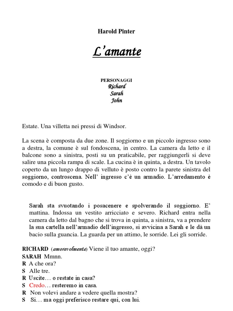 RICHARD (amorevolmente) Viene il tuo amante, oggi? SARAH Mmnn. R A che ora? S Alle tre. R Uscite o restate in casa? S Credo resteremo in casa. R Non volevi andare a vedere quella mostra? S Si ma oggi preferisco restare qui, con lui.