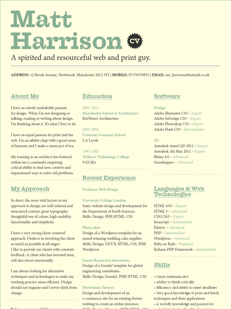 I have an utterly unshakable passion for design. When Im not designing or talking, reading or writing about design, Im thinking about it. Its what I love to do. I have an equal passion for print and the web. Im an affable chap with a good sense of humour and I make a mean pot of tea. My training as an architect has fostered within me a constantly enquiring critical ability to find new, creative and impassioned ways to solve old problems.