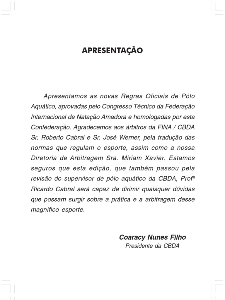Apresentamos as novas Regras Oficiais de Plo Aqutico, aprovadas pelo Congresso Tcnico da Federao Internacional de Natao Amadora e homologadas por esta Confederao. Agradecemos aos rbitros da FINA / CBDA Sr. Roberto Cabral e Sr. Jos Werner, pela traduo das normas que regulam o esporte, assim como a nossa Diretoria de Arbitragem Sra. Miriam Xavier. Estamos seguros que esta edio, que tambm passou pela reviso do supervisor de plo aqutico da CBDA, Prof Ricardo Cabral ser capaz de dirimir quaisquer dvidas que possam surgir sobre a prtica e a arbitragem desse magnfico esporte.