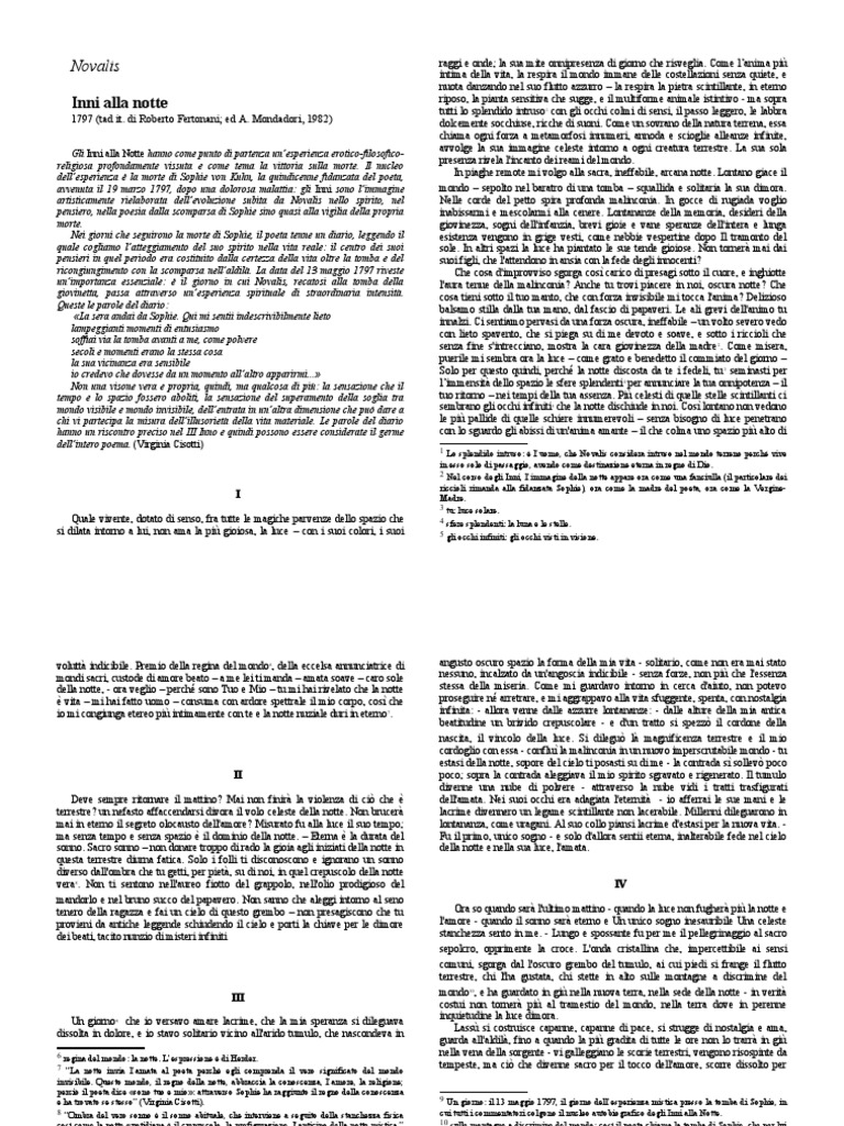 dell’esperienza è la morte di Sophie von Kuhn, la quindicenne fidanzata del poeta, In piaghe remote mi volgo alla sacra, ineffabile, arcana notte. Lontano giace il