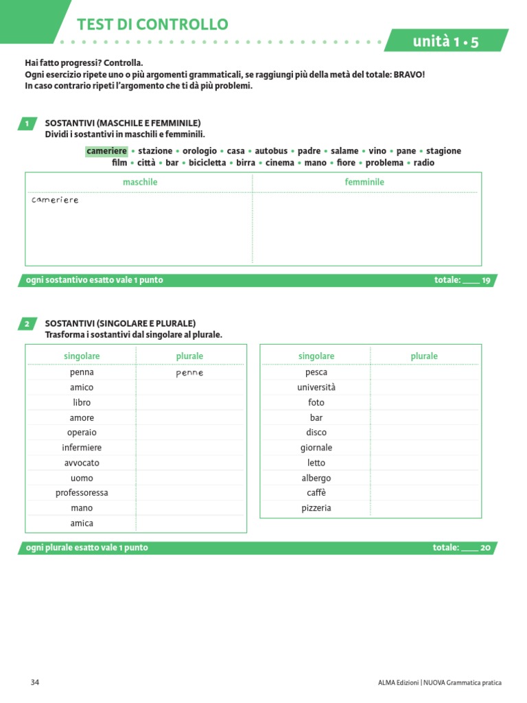 ogni plurale esatto vale 1 punto totale: 20