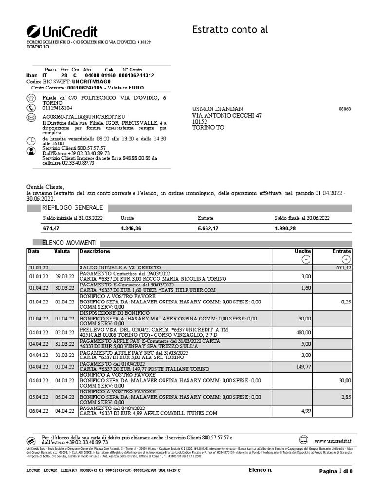 le inviamo l'estratto del suo conto corrente e l’elenco, in ordine cronologico, delle operazioni effettuate nel periodo 01.04.2022 -