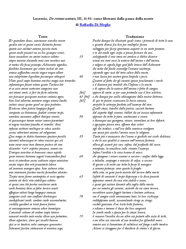 Lucrezio, De rerum natura, III, 31-93: come liberarsi dalla paura della morte