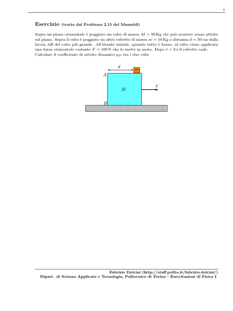 sul piano. Sopra il cubo è poggiato un altro cubetto di massa m = 10 Kg a distanza d = 50 cm dalla