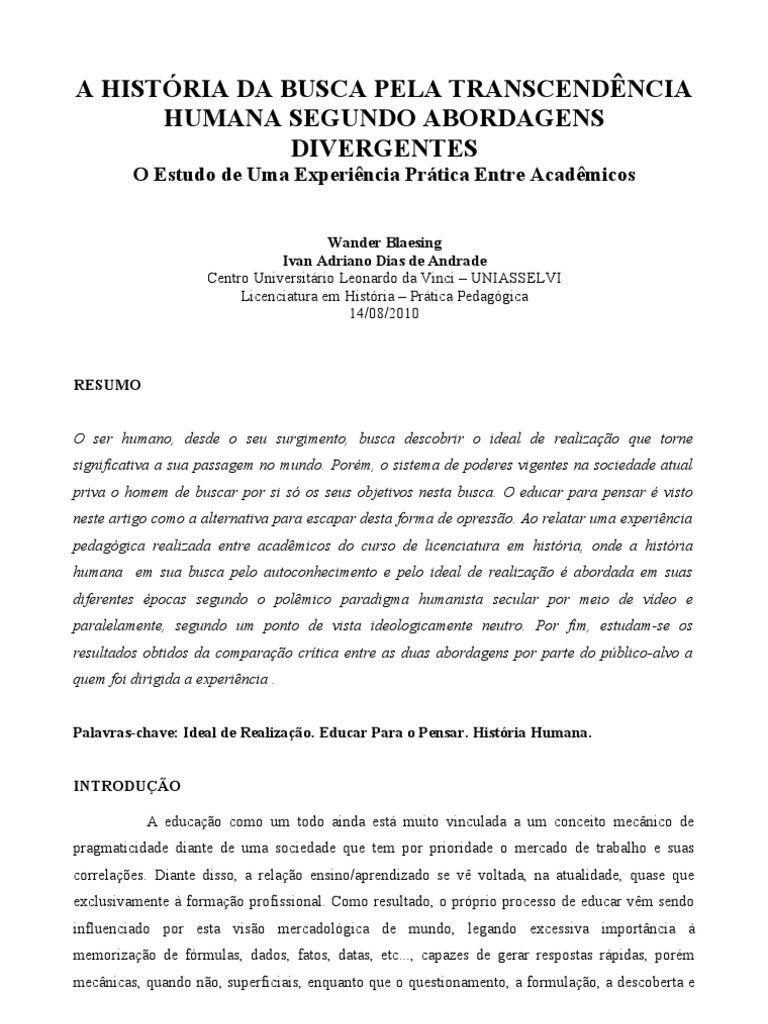 RESUMO O ser humano, desde o seu surgimento, busca descobrir o ideal de realizao que torne significativa a sua passagem no mundo. Porm, o sistema de poderes vigentes na sociedade atual priva o homem de buscar por si s os seus objetivos nesta busca. O educar para pensar visto neste artigo como a alternativa para escapar desta forma de opresso. Ao relatar uma experincia pedaggica realizada entre acadmicos do curso de licenciatura em histria, onde a histria humana em sua busca pelo autoconhecimento e pelo ideal de realizao abordada em suas diferentes pocas segundo o polmico paradigma humanista secular por meio de vdeo e paralelamente, segundo um ponto de vista ideologicamente neutro. Por fim, estudam-se os resultados obtidos da comparao crtica entre as duas abordagens por parte do pblico-alvo a quem foi dirigida a experincia . Palavras-chave: Ideal de Realizao. Educar Para o Pensar. Histria Humana. INTRODUO A educao como um todo ainda est muito vinculada a um conceito mecnico de pragmaticidade diante de uma sociedade que tem por prioridade o mercado de trabalho e suas correlaes. Diante disso, a relao ensino/aprendizado se v voltada, na atualidade, quase que exclusivamente formao profissional. Como resultado, o prprio processo de educar vm sendo influenciado por esta viso mercadolgica de mundo, legando excessiva importncia memorizao de frmulas, dados, fatos, datas, etc..., capazes de gerar respostas rpidas, porm mecnicas, quando no, superficiais, enquanto que o questionamento, a formulao, a descoberta e