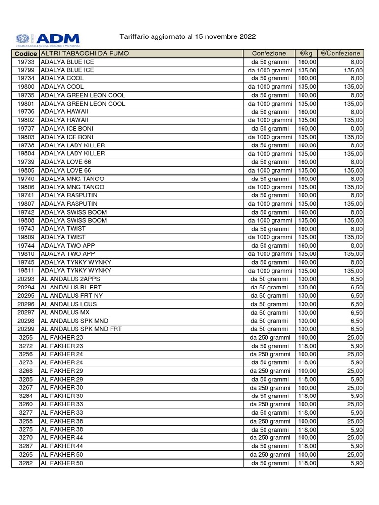 Codice ALTRI TABACCHI DA FUMO Confezione €/kg €/Confezione