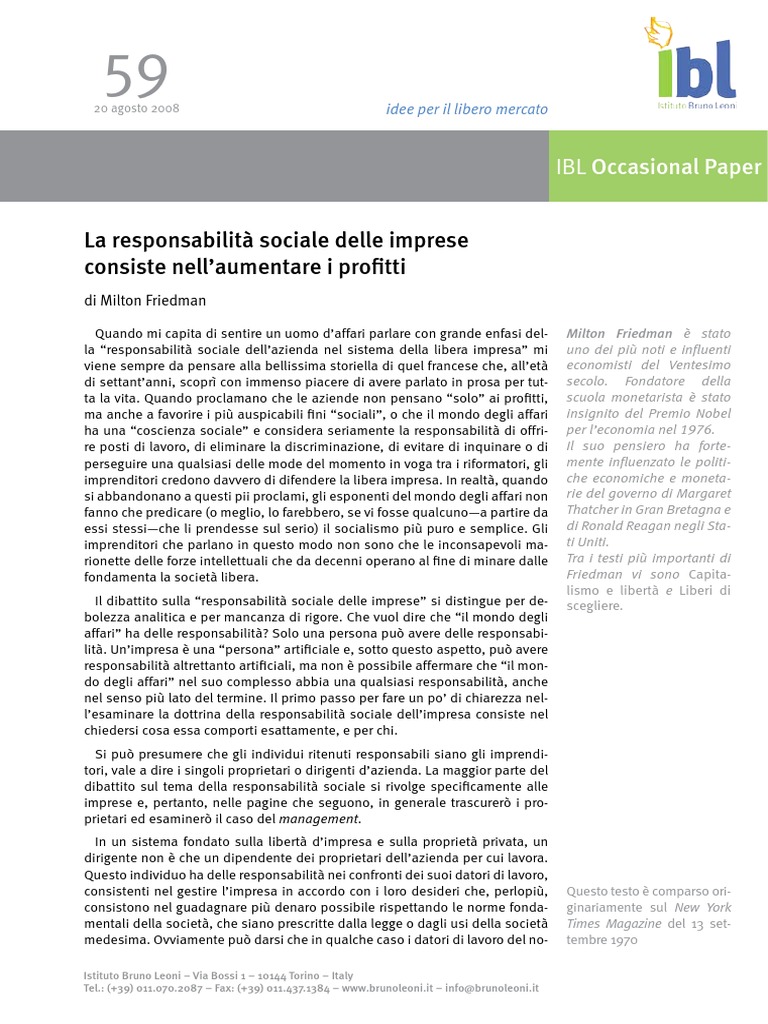 la “responsabilità sociale dell’azienda nel sistema della libera impresa” mi uno dei più noti e influenti