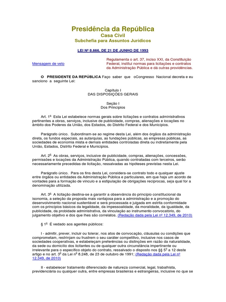 O PRESIDENTE DA REPBLICA Fao saber que oCongresso Nacional decreta e eu sanciono a seguinte Lei: Captulo I DAS DISPOSIES GERAIS Seo I Dos Princpios Art. 1 Esta Lei estabelece normas gerais sobre licitaes e contratos administrativos pertinentes a obras, servios, inclusive de publicidade, compras, alienaes e locaes no mbito dos Poderes da Unio, dos Estados, do Distrito Federal e dos Municpios. Pargrafo nico. Subordinam-se ao regime desta Lei, alm dos rgos da administrao direta, os fundos especiais, as autarquias, as fundaes pblicas, as empresas pblicas, as sociedades de economia mista e demais entidades controladas direta ou indiretamente pela Unio, Estados, Distrito Federal e Municpios. Art. 2 As obras, servios, inclusive de publicidade, compras, alienaes, concesses, permisses e locaes da Administrao Pblica, quando contratadas com terceiros, sero necessariamente precedidas de licitao, ressalvadas as hipteses previstas nesta Lei. Pargrafo nico. Para os fins desta Lei, considera-se contrato todo e qualquer ajuste entre rgos ou entidades da Administrao Pblica e particulares, em que haja um acordo de vontades para a formao de vnculo e a estipulao de obrigaes recprocas, seja qual for a denominao utilizada. Art. 3 A licitao destina-se a garantir a observncia do princpio constitucional da isonomia, a seleo da proposta mais vantajosa para a administrao e a promoo do desenvolvimento nacional sustentvel e ser processada e julgada em estrita conformidade com os princpios bsicos da legalidade, da impessoalidade, da moralidade, da igualdade, da publicidade, da probidade administrativa, da vinculao ao instrumento convocatrio, do julgamento objetivo e dos que lhes so correlatos. (Redao dada pela Lei n 12.349, de 2010) 1 vedado aos agentes pblicos: I - admitir, prever, incluir ou tolerar, nos atos de convocao, clusulas ou condies que comprometam, restrinjam ou frustrem o seu carter competitivo, inclusive nos casos de sociedades cooperativas, e estabeleam preferncias ou distines em razo da naturalidade, da sede ou domiclio dos licitantes ou de qualquer outra circunstncia impertinente ou o irrelevante para o especfico objeto do contrato, ressalvado o disposto nos 5 a 12 deste o o artigo e no art. 3 da Lei n 8.248, de 23 de outubro de 1991; (Redao dada pela Lei n 12.349, de 2010) II - estabelecer tratamento diferenciado de natureza comercial, legal, trabalhista, previdenciria ou qualquer outra, entre empresas brasileiras e estrangeiras, inclusive no que se
