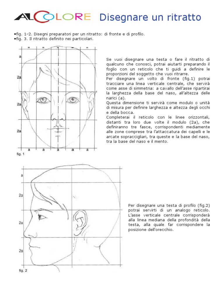 Se vuoi disegnare una testa o fare il ritratto di qualcuno c he conosc i, potrai aiutarti preparando il foglio c on un retic olo che ti guidi a definire le proporzioni del soggetto che vuoi ritrarre. Per disegnare un volto di fronte (fig.1) potrai tracciare una linea vertic ale centrale, c he servir come asse di simmetria: a c avallo dellasse ripartirai la larghezza della base del naso, allaltezza delle narici (a). Questa dimensione ti servir c ome modulo o unit di misura per definire larghezza e altezza degli occ hi e della bocc a. Completerai il retic olo con le linee orizzontali, distanti tra loro due volte il modulo (2a), c he definiranno tre fasce, corrispondenti mediamente alle zone comprese tra lattacc atura dei c apelli e le arcate soprac cigliari, tra queste e la base del naso, tra la base del naso e il mento.