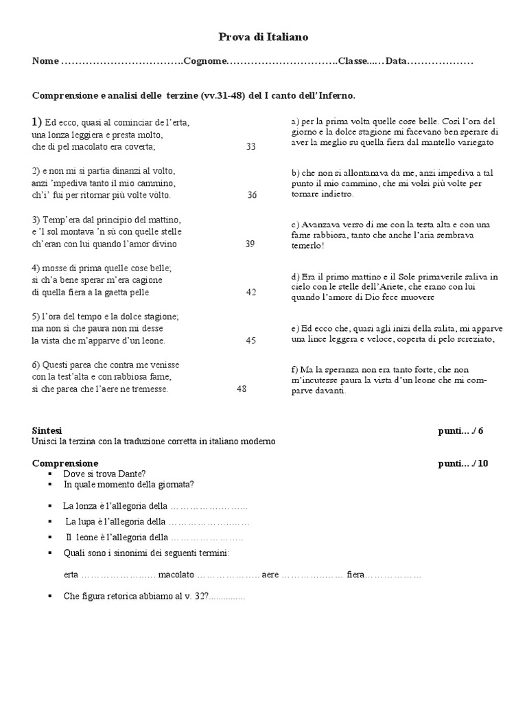 Comprensione e analisi delle terzine (vv.31-48) del I canto dell’Inferno.