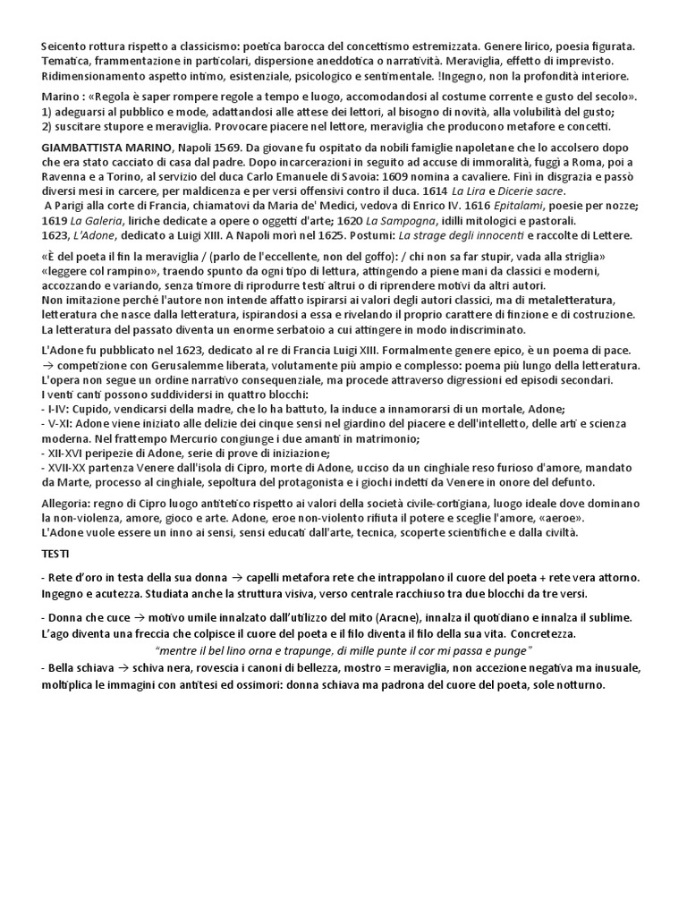 L'Adone fu pubblicato nel 1623, dedicato al re di Francia Luigi XIII. Formalmente genere epico, è un poema di pace.