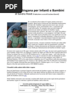 E' possibile svezzare un bimbo vegano in quanto questo tipo di alimentazione risulta molto fisiologica fino a 12 mesi di et. Tale regime alimentare basato interamente su cibi di origine vegetale e pu essere tranquillamente proseguito fino alla senescenza purch sia seguito un programma alimentare adeguato e bilanciato, vario, e siano mantenute alcune accortezze. Un bimbo fino al compimento di un anno di et non dovrebbe assumere cibi di origine animale: non solo carne, pesce e salumi ma neppure latte, uova, formaggi e derivati e neanche lo zucchero. Lo svezzamento utile iniziarlo a partire dai 6 mesi in quanto fino ad allora il bimbo dovrebbe assumere esclusivamente latte materno o latti di formula adattati se ci sono esigenze particolari. Il bambino potrebbe continuare con il latte materno ovviamente insieme ad altri cibi fino a 3- 4 anni: infatti una o due poppate di latte materno durante la giornata servono per migliorare lo stato di salute del bimbo, rafforzare il suo sistema immunitario ed anche migliorare lo stato di salute della mamma. Per impostare uno svezzamento vegano si parte dai cereali naturalmente senza glutine (che comunque possono gi essere usati a partire dai 4 mesi) cio riso, mais e miglio. I cerali con glutine vanno inseriti a partire dall'anno di et perch il glutine pu essere una proteina allergizzante per i bimbi predisposti e determinare celiachia. L'altra parte del pasto sono i legumi (anch'essi contrariamente a ci che si crede possono essere introdotti a partire dai 4 mesi) in particolare lenticchie rosse decorticate o fagioli e ceci accuratamente passati al passaverdure per eliminare tutte le fibre, essi forniscono la parte proteica e poi le verdure come carote, zucchine o patate (che non sono verdure ma risultano utili per addensare la pappa) o tapioca che un tubero utile per lo svezzamento. Sono necessari anche i semi oleaginosi e la frutta secca in quanto fonte di proteine e grassi buoni : ad [Link] di sesamo o di lino e mandorle. E' utile partire con la crema di cereali fatta ad esempio con riso integrale cotto per 90 minuti (le dosi sono 1 parte di riso con 7-9 parti di acqua) in tal modo si ottiene una crema di riso che poi va passata in un colino a maglie strette per eliminare tutte le buccie. Tale crema un ottima base sia per ottenere piatti dolci per la merenda o gli spuntini o salati per il pranzo o per la cena. All'interno della crema si possono stemperare 2 cucchiaini di legumi o ceci o fagioli passati da condire con semi di lino o sesamo polverizzato o una crema di zucca o carote o una crema di mandorle e nocciole o del thain ( attenzione per alle etichette alimentari di questi prodotti che non devono contenere farina di uova o latte in polvere o zucchero n tantomeno addensanti o coloranti). La stessa base di crema di cereali pu essere dolcificata con malto o frutta fresca o mandorle polverizzate o purea di frutta cotta per avere uno spuntino oppure una merenda dolce e sana. Si visto che sono numerosi i vantaggi dello svezzamento vegano: i bambini sono sicuramente pi attivi e svegli e oltre ad insegnare loro il rispetto per l'ambiente, la natura e gli animali si abituano a consumare alimenti pi sani e genuini e nutrizionalmete pi completi anche una volta divenuti adulti. Si visto inoltre che da adulti saranno meno soggetti a sovrappeso ed obesit e meno predisposti alle malattie cronico degenerative come colesterolo alto, diabete, gotta, patologie cardiovascolari e persino tumori. Per tutte queste ragioni, lo svezzamento vegano raccomandato per tutti non solo per i bimbi nati da genitori vegetariani o vegani.