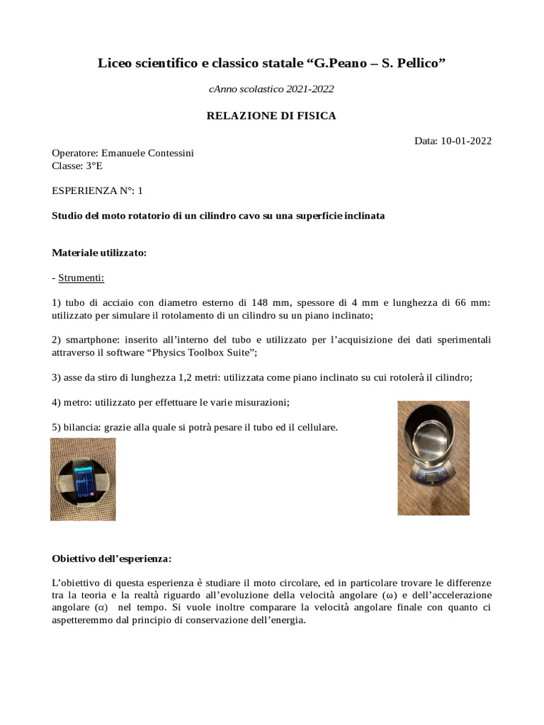Studio del moto rotatorio di un cilindro cavo su una superficie inclinata