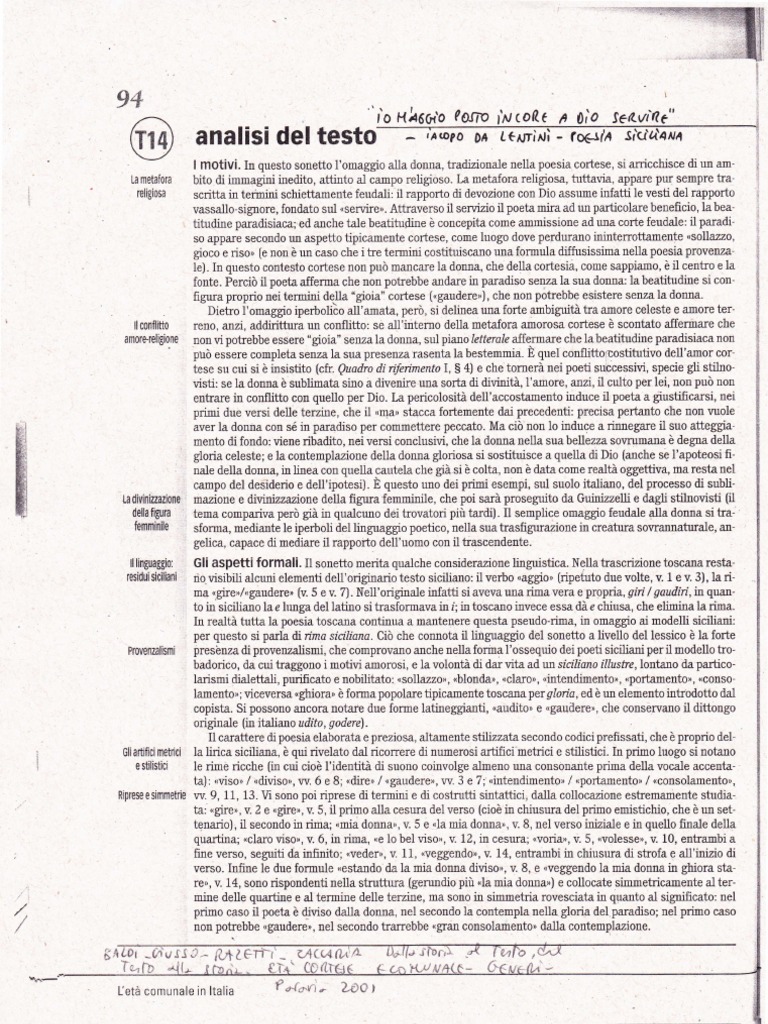 residuishiliani [Link] alcuni elementi dell'originario testo siciliano: il verbo naggloo (ripetuto due volte, v. 1 e v. 3), la rima ugireo/ugaudere, (v. 5 ev.7). Nell'originale infatti si aveva 'na rimavera e propria, gii / gaudii, in quanto in siciliano la e hrnga del lati:ro si trasformava in i; in toscano invece essa d e chiusa, che elimina la rima. In realt. tutta la poesia toscana conti:rua a mantenere questa pseudo-rima, in omaggio ai modelli siciliani: per questo si parla dtima sciliana. Ci che connota il linguaggio del sonetto a livello del lessico la forte Provenzalismi presnza di provenzalismi; che comprovano anche nella forma I'ossequio dei poeti siciliani per il modello trobadorico, da cui traggono i motivi amorosi, e la volont di dar vita advn sctliano llustre,lonta:ro da particolarismi dialettali, purificato e nobilitato: Kso\lazzoD,,londao, (claroD, uintendimento,r, uportamentoD, (collso-