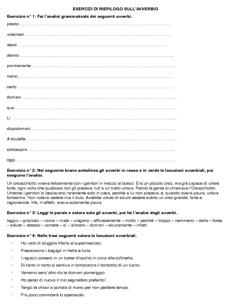 Esercizio n° 6: Sottolinea con due colori diversi gli avverbi (9) e le locuzioni avverbiali (9).