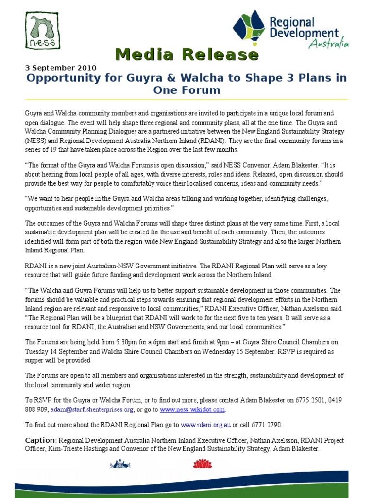 Guyra and Walcha community members and organisations are invited to participate in a unique local forum and open dialogue. The event will help shape three regional and community plans, all at the one time. The Guyra and Walcha Community Planning Dialogues are a partnered initiative between the New England Sustainability Strategy (NESS) and Regional Development Australia Northern Inland (RDANI). They are the final community forums in a series of 19 that have taken place across the Region over the last few months. The format of the Guyra and Walcha Forums is open discussion, said NESS Convenor, Adam Blakester. It is about hearing from local people of all ages, with diverse interests, roles and ideas. Relaxed, open discussion should provide the best way for people to comfortably voice their localised concerns, ideas and community needs. We want to hear people in the Guyra and Walcha areas talking and working together, identifying challenges, opportunities and sustainable development priorities. The outcomes of the Guyra and Walcha Forums will shape three distinct plans at the very same time. First, a local sustainable development plan will be created for the use and benefit of each community. Then, the outcomes identified will form part of both the region-wide New England Sustainability Strategy and also the larger Northern Inland Regional Plan. RDANI is a new joint Australian-NSW Government initiative. The RDANI Regional Plan will serve as a key resource that will guide future funding and development work across the Northern Inland. The Walcha and Guyra Forums will help us to better support sustainable development in those communities. The forums should be valuable and practical steps towards ensuring that regional development efforts in the Northern Inland region are relevant and responsive to local communities, RDANI Executive Officer, Nathan Axelsson said. The Regional Plan will be a blueprint that RDANI will work to for the next five to ten years. It will serve as a resource tool for RDANI, the Australian and NSW Governments, and our local communities. The Forums are being held from 5.30pm for a 6pm start and finish at 9pm at Guyra Shire Council Chambers on Tuesday 14 September and Walcha Shire Council Chambers on Wednesday 15 September. RSVP is required as supper will be provided. The Forums are open to all members and organisations interested in the strength, sustainability and development of the local community and wider region. To RSVP for the Guyra or Walcha Forum, or to find out more, please contact Adam Blakester on 6775 2501, 0419 808 909, adam@starfishenterprises.org, or go to www.ness.wikidot.com. To find out more about the RDANI Regional Plan go to www.rdani.org.au or call 6771 2790. Caption: Regional Development Australia Northern Inland Executive Officer, Nathan Axelsson, RDANI Project Officer, Kim-Trieste Hastings and Convenor of the New England Sustainability Strategy, Adam Blakester.