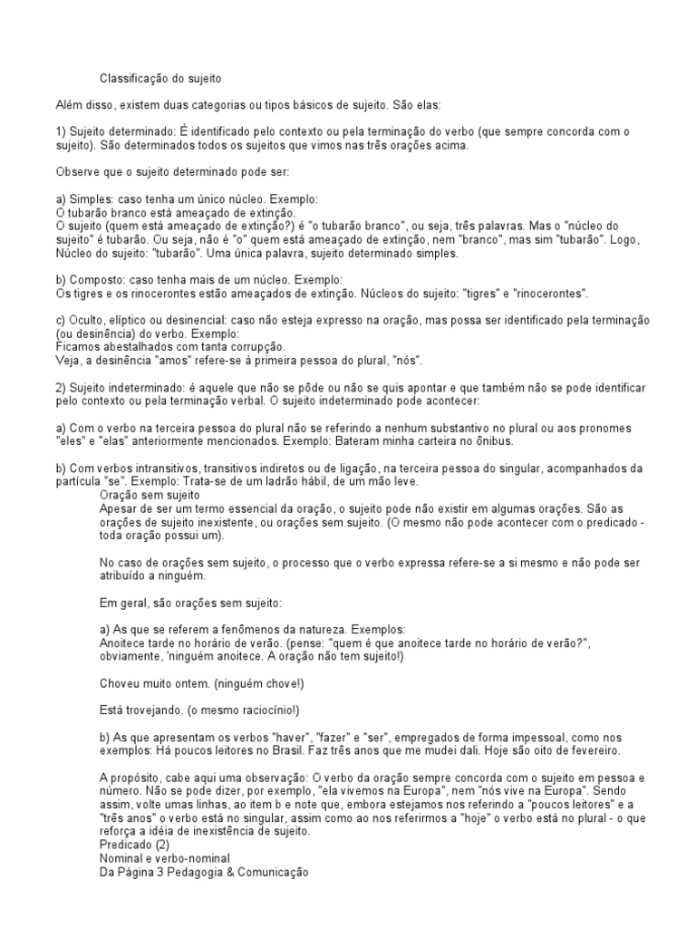 So elas: 1) Sujeito determinado: identificado pelo contexto ou pela terminao do verbo (que sempre concorda com o sujeito). So determinados todos os sujeitos que vimos nas trs oraes acima. Observe que o sujeito determinado pode ser: a) Simples: caso tenha um nico ncleo. Exemplo: O tubaro branco est ameaado de extino. O sujeito (quem est ameaado de extino?) "o tubaro branco", ou seja, trs palavras. Mas o "ncleo do sujeito" tubaro. Ou seja, no "o" quem est ameaado de extino, nem "branco", mas sim "tubaro". Logo, Ncleo do sujeito: "tubaro". Uma nica palavra, sujeito determinado simples. b) Composto: caso tenha mais de um ncleo. Exemplo: Os tigres e os rinocerontes esto ameaados de extino. Ncleos do sujeito: "tigres" e "rinocerontes". c) Oculto, elptico ou desinencial: caso no esteja expresso na orao, mas possa ser identificado pela terminao (ou desinncia) do verbo. Exemplo: Ficamos abestalhados com tanta corrupo. Veja, a desinncia "amos" refere-se primeira pessoa do plural, "ns". 2) Sujeito indeterminado: aquele que no se pde ou no se quis apontar e que tambm no se pode identificar pelo contexto ou pela terminao verbal. O sujeito indeterminado pode acontecer: a) Com o verbo na terceira pessoa do plural no se referindo a nenhum substantivo no plural ou aos pronomes "eles" e "elas" anteriormente mencionados. Exemplo: Bateram minha carteira no nibus. b) Com verbos intransitivos, transitivos indiretos ou de ligao, na terceira pessoa do singular, acompanhados da partcula "se". Exemplo: Trata-se de um ladro hbil, de um mo leve. Orao sem sujeito Apesar de ser um termo essencial da orao, o sujeito pode no existir em algumas oraes. So as oraes de sujeito inexistente, ou oraes sem sujeito. (O mesmo no pode acontecer com o predicado toda orao possui um). No caso de oraes sem sujeito, o processo que o verbo expressa refere-se a si mesmo e no pode ser atribudo a ningum. Em geral, so oraes sem sujeito: a) As que se referem a fenmenos da natureza. Exemplos: Anoitece tarde no horrio de vero. (pense: "quem que anoitece tarde no horrio de vero?", obviamente, 'ningum anoitece. A orao no tem sujeito!) Choveu muito ontem. (ningum chove!) Est trovejando. (o mesmo raciocnio!) b) As que apresentam os verbos "haver", "fazer" e "ser", empregados de forma impessoal, como nos exemplos: H poucos leitores no Brasil. Faz trs anos que me mudei dali. Hoje so oito de fevereiro. A propsito, cabe aqui uma observao: O verbo da orao sempre concorda com o sujeito em pessoa e nmero. No se pode dizer, por exemplo, "ela vivemos na Europa", nem "ns vive na Europa". Sendo assim, volte umas linhas, ao item b e note que, embora estejamos nos referindo a "poucos leitores" e a "trs anos" o verbo est no singular, assim como ao nos referirmos a "hoje" o verbo est no plural - o que refora a idia de inexistncia de sujeito. Predicado (2) Nominal e verbo-nominal Da Pgina 3 Pedagogia & Comunicao