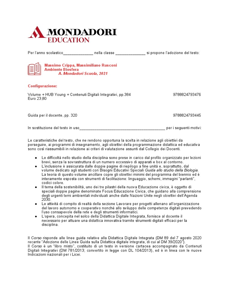 Per l’anno scolastico______________ nella classe ______________ si propone l’adozione del testo: