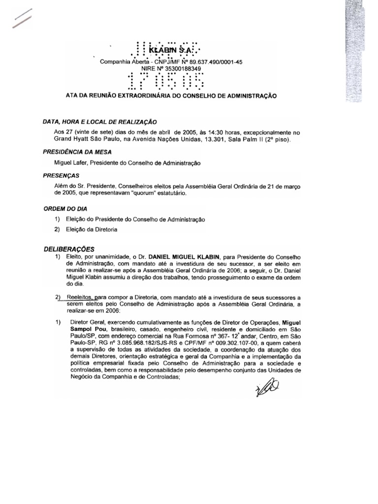 KlabinS.A. ",.'."" Ata da Reunio Extraordinria do Cons~lh':1 d'f ~dMil'1.itra~o Realizada em 27 de abril de 2005. s ~;;!.l!)--!iQ.,~ .
