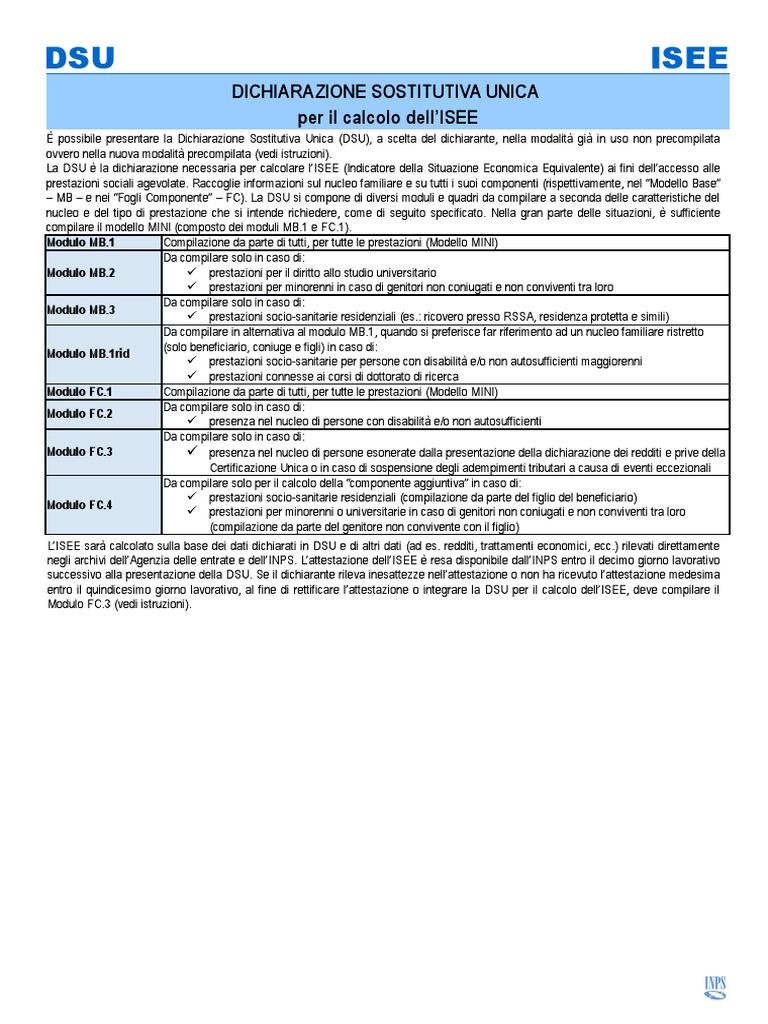 – MB – e nei “Fogli Componente” – FC). La DSU si compone di diversi moduli e quadri da compilare a seconda delle caratteristiche del