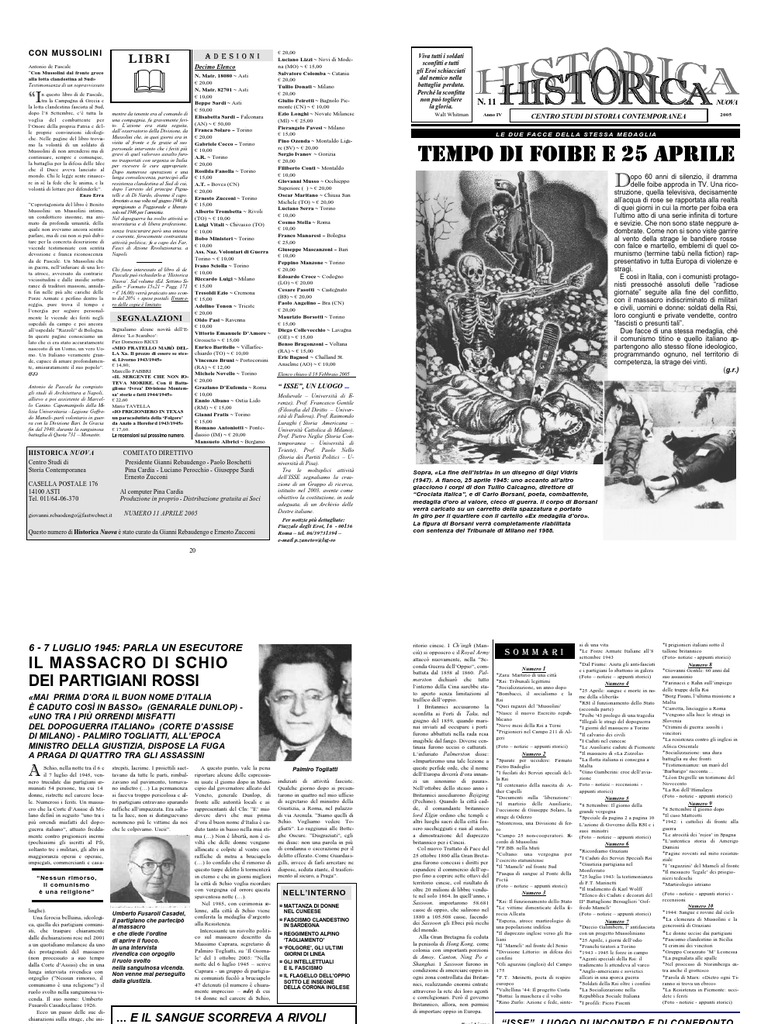 *25 Aprile: sangue e morte in nome della libert *RSI il funzionamento dello Stato (seconda parte) *Foibe '43 prologo di una tragedia *Illegali le stragi del dopoguerra *I giorni del massacro a Torino *Il calvario dei civili *I Caduti nel cuneese *Le Ausiliarie cadute di Piemonte *Il massacro di La Zizzola *La flotta italiana si consegna a Malta *Gino Gamberini: eroe dellaviazione Foto notizie recensioni appunti storici)