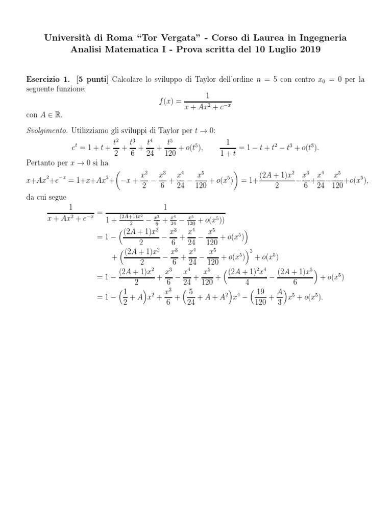 Esercizio 1. [5 punti] Calcolare lo sviluppo di Taylor dell’ordine n = 5 con centro x0 = 0 per la
