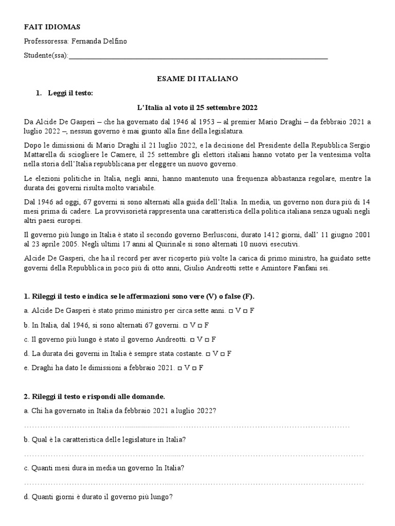 b. In Italia, dal 1946, si sono alternati 67 governi. □ V □ F